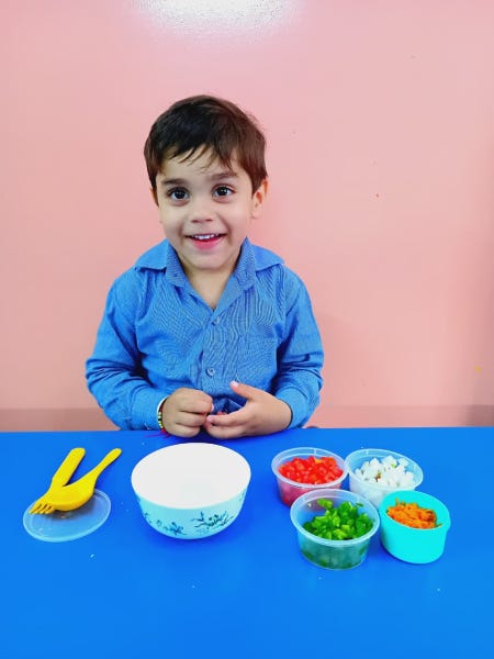 A big plate can intimidate a tiny child. Offer small portions; let them ask for seconds. It gives them a voice and builds confidence in expressing needs — something we strongly reinforce at our Top School New Delhi network.